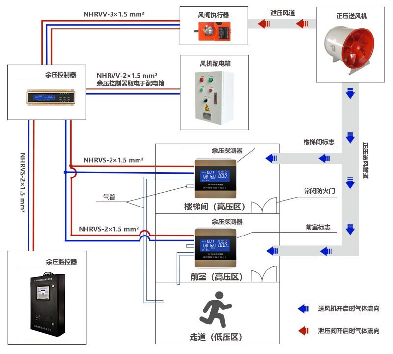 2.余壓控制器(箱)由風(fēng)機(jī)配電箱供電,負(fù)責(zé)給余壓探測(cè)器和泄壓閥執(zhí)行器供電。