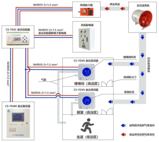1、發(fā)生火災(zāi)時,正壓送風(fēng)系統(tǒng)啟動,著火層及上下相鄰兩層風(fēng)口開啟,圖中藍色箭頭表示正壓送風(fēng)機開啟時空氣的流動方向,依據(jù)安全逃生原則,余壓監(jiān)控應(yīng)滿足防煙樓梯間壓力>前室壓力>走道壓力的壓力遞增分布。