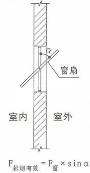 當(dāng)開窗角小于或等于70°時,其面積應(yīng)按窗最大開啟時的豎向投影面積計算:排煙有效面積=可開啟窗面積*Sinα